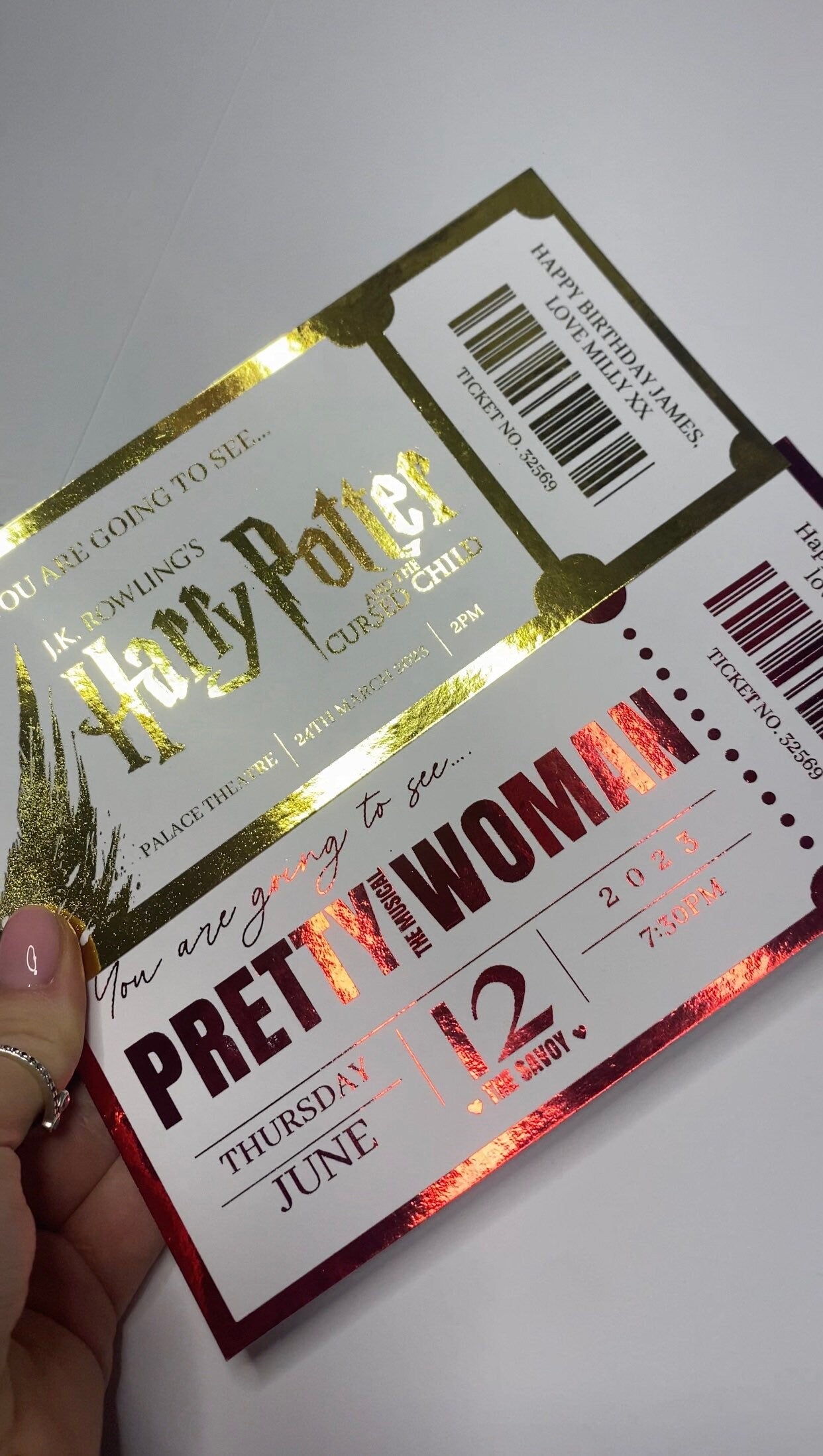 Luxury Foiled Ticket for any event or occasion! Surprise your loved ones with a unique keep sake that will make them say ‘WOW!’ Out load! These vouchers cover all events whether it be concerts, theatre show, wine tasting, brunch, a weekend away, escape room, concert, theatre show and for all occasions, birthday, anniversary, Mother’s Day, valentines, graduation, etc.